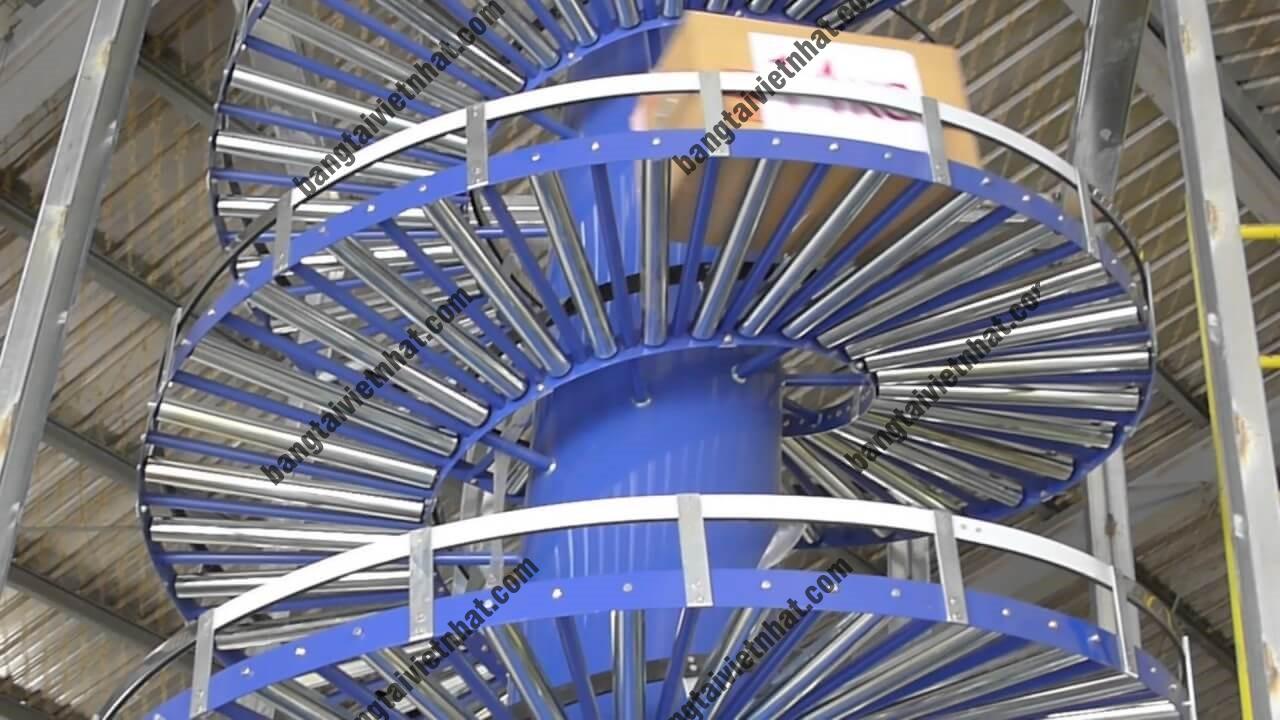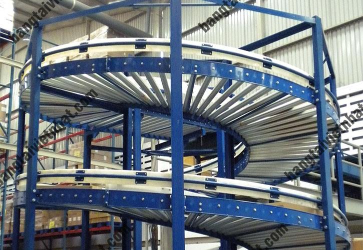 Dàn con lăn xoắn ốc: Phục vụ vận chuyển hàng hóa từ nới cao đến thấp nhờ nguyên lí trọng lực. Phù hợp cho các vị trí nhà xưởng hẹp ít không gian diện tích.