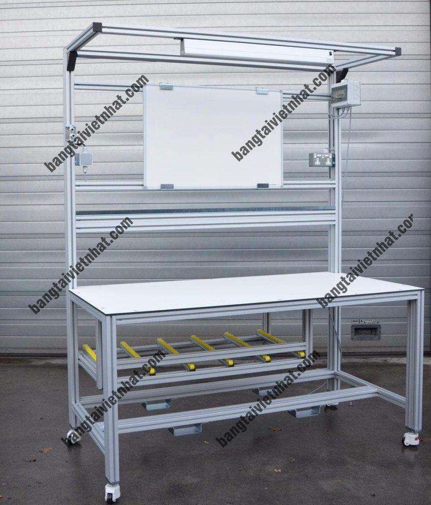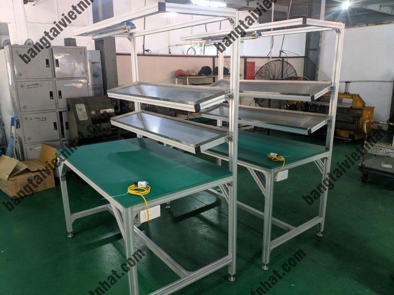 - Bàn được thiết kế kèm theo hệ thống đèn, công tác và một số phụ kiện cần thiết tùy vào lĩnh vực sản xuất cụ thể của doanh nghiệp đặt hàng. Nhôm định hình công nghiệp