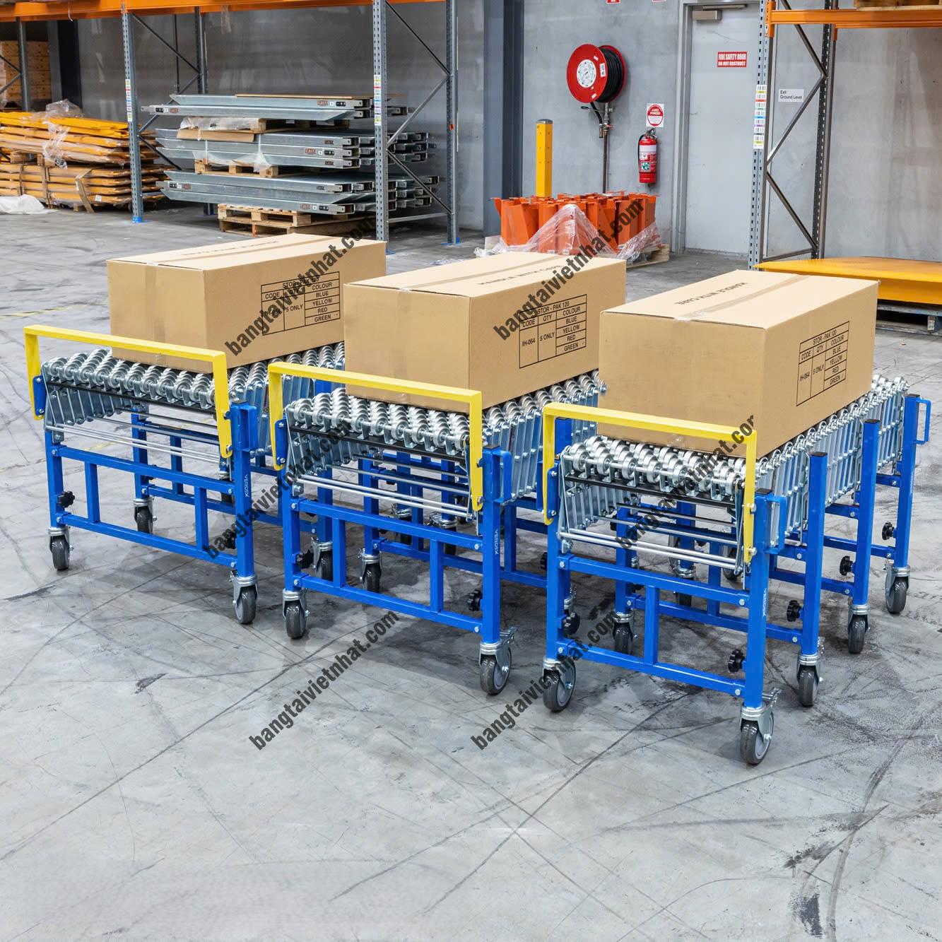 Băng tải con lăn linh hoạt được sử dụng để di chuyển các thùng hàng trượt theo băng tải con lăn thường dùng trong việc bốc dỡ hàng hóa.